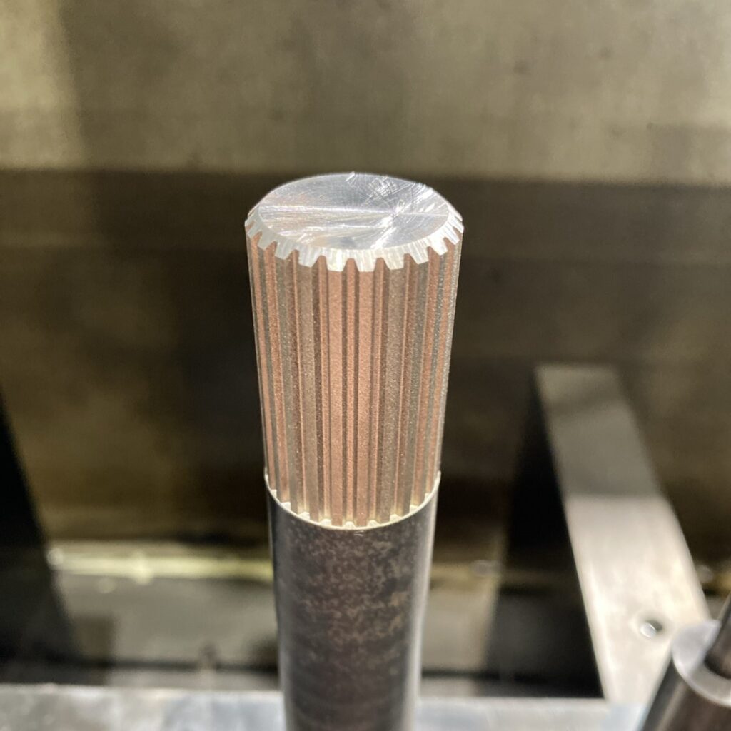 電極が摩耗せずワークに触れない放電加工だからこそ、この写真のように電極の形状が寸法変化なく製品に転写されます。この「誤差なき再現性」こそが、切削加工では避けられない焼き入れ後の歪みの心配を排除し、特殊なスプライン形状内歯車の厳しい要求に応える当社の裏付けです。